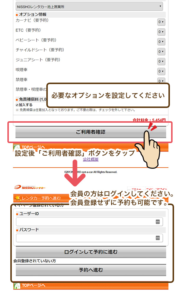 会員の方はIDとパスワードを入力して「ログイン」ボタンをクリックして、レンタカー予約画面へお進み下さい。